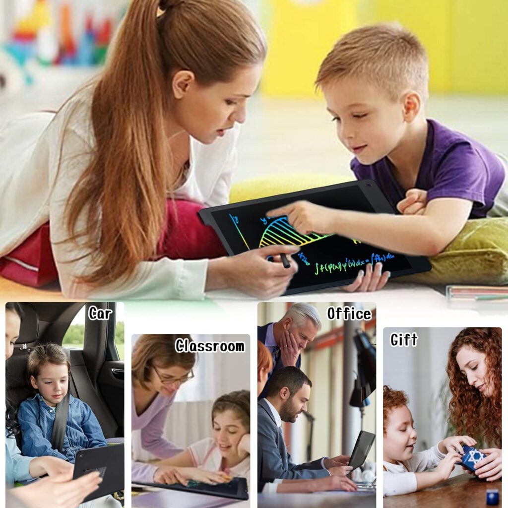 The 12 inch size of drawing board would make it easy to be taken out everywhere. And the writing tablet is made from friendly material, safe for school use and all around the house, office and car.